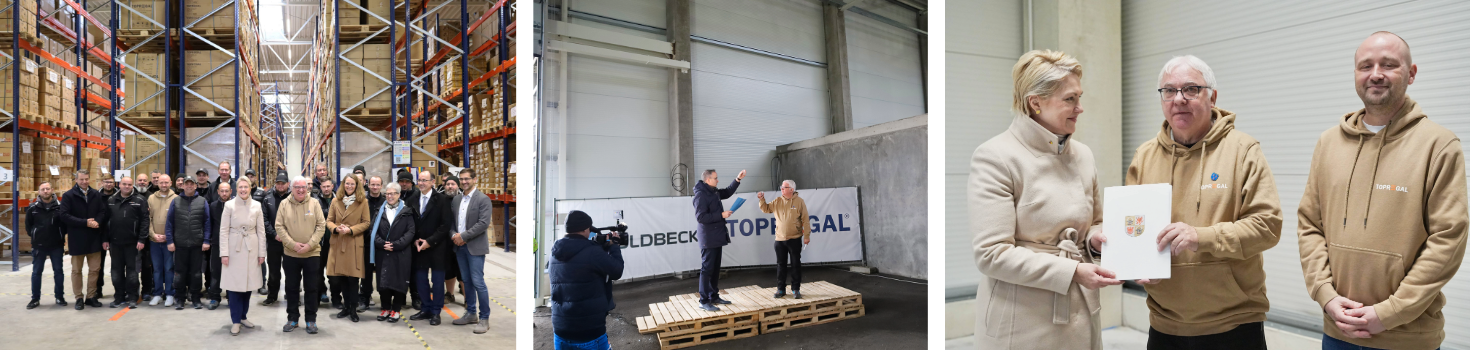 Die Erweiterung von TOPREGALS Lager- und Produktionsstätte im Industriepark Berlin-Stettin in Pasewalk schreitet beständig voran: Nur drei Jahre nach der Ansiedlung im Industriepark und der Fertigstellung der ersten vier Hallen feierte das mittelständische Unternehmen für Lager- und Betriebseinrichtungen am 3. Dezember 2024 Richtfest für zwei neue Hallen. Im feierlichen Rahmen informierten sich dabei zahlreiche geladene Gäste – darunter Ministerpräsidentin des Landes Mecklenburg-Vorpommern Manuela Schwesig, designierter Minister für Wirtschaft, Infrastruktur, Tourismus und Arbeit des Landes Mecklenburg-Vorpommern Wolfgang Blank, Parlamentarischer Staatssekretär für Vorpommern und das östliche Mecklenburg Heiko Miraß, Referatsleiter im Ministerium für Wirtschaft, Infrastruktur, Tourismus und Arbeit Mecklenburg-Vorpommern Ralf Sippel, Landrat im Landkreis Vorpommern-Greifswald Michael Sack und der Bürgermeister der Stadt Pasewalk Danny Rodewald – über das Pasewalker Gewerbegebiet. Nach einer Begrüßung durch Jürgen Effner und Gino Klatt, Geschäftsführer der TOPREGAL GmbH, folgte der traditionelle Richtspruch durch Jörg Heuer, Leiter der Goldbeck Geschäftsstelle Schwerin. Anschließend hielt Manuela Schwesig eine Ansprache. „TOPREGAL hat dem Industriepark Berlin-Stettin mit den ersten vier Hallen Leben eingehaucht. Das war 2021. Jetzt kommen zwei weitere Hallen dazu. Mindestens 20 neue Arbeitsplätze sollen dadurch entstehen. Ich freue mich sehr, dass TOPREGAL in Pasewalk so gut angekommen ist. Der Industriepark ist ein gutes Beispiel für das, was die Landesregierung mit ihrem Industriekonzept für Mecklenburg-Vorpommern erreichen will: Mehr Industrie. Mehr Wertschöpfung. Mehr Arbeitsplätze“, so die Ministerpräsidentin. „Nach der Fertigstellung unserer ersten vier Hallen mit über 20.000 Quadratmetern Fläche wurde schnell klar, dass wir unseren Pasewalker Standort zusätzlich erweitern wollen. Auf einer angrenzenden Fläche entstehen deshalb gerade diese beiden neuen Hallen mit jeweils 5.000 Quadratmetern Fläche. So können wir der großen Nachfrage nach unseren Produkten der Marke SoloPort gerecht werden und schaffen weitere Arbeitsplätze. Zukünftig sollen hier unter anderem Neuheiten wie Solar-Parkplatzüberdachungen gefertigt, gelagert und versendet werden“, berichtet Jürgen Effner.