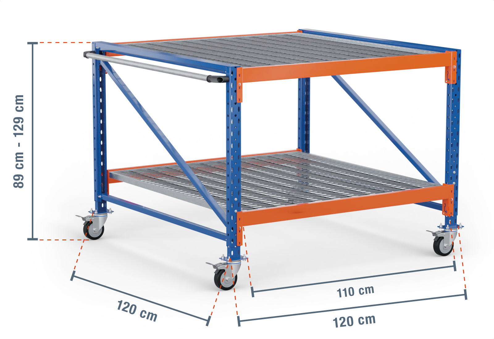 1,2 m Arbeitstisch fahrbar MFW1000-AT / 120 cm tief / 890 - 1.290 mm hoch / 2 Ebenen / Auflage Gitterrost