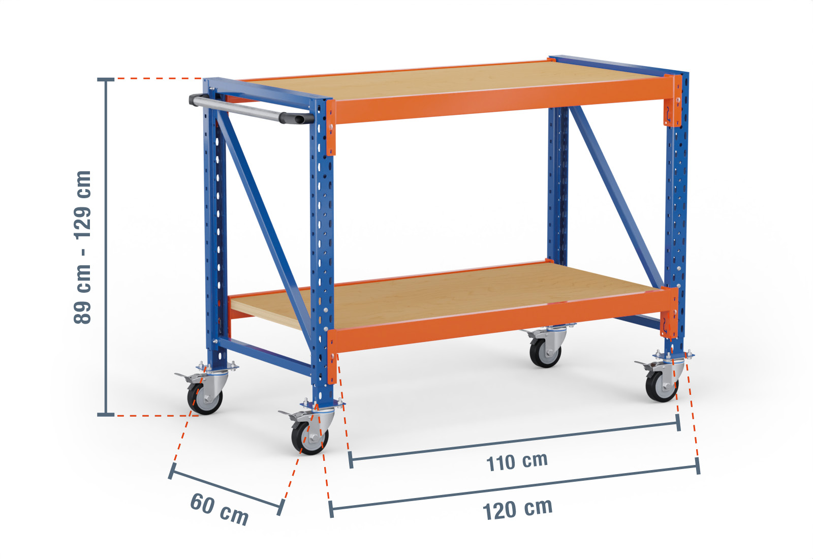 1,2 m Arbeitstisch fahrbar MFW1000-AT / 60 cm tief / 890 - 1.290 mm hoch / 2 Ebenen / Auflage Multiplex