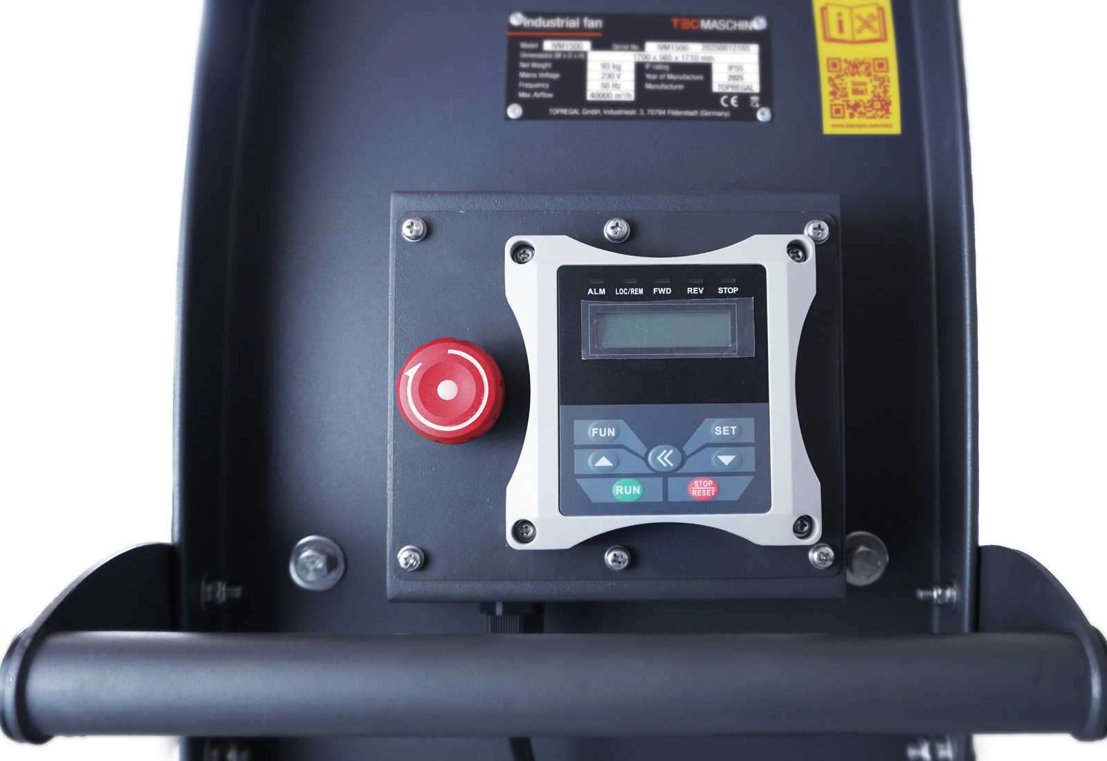 Mit seinem großen Durchmesser von 1.500 mm bringt er bis zu 40.000 m³/h Luft pro Stunde in Bewegung – genug, um auch größere Hallen ordentlich durchzulüften. Die Maße liegen bei ca. 1.700 mm x 565 mm x 1.710 mm, das Gewicht beträgt 93 kg. Zwei Laufrollen und zwei Lenkrollen (Ø 140 mm) aus Gummi erleichtern das Positionieren vor Ort. Das 8 m lange Anschlusskabel bietet zusätzlich flexiblen Spielraum beim Aufstellen. Gesteuert wird der Ventilator über ein seitlich angebrachtes Bedienfeld mit Tasten. Die Drehzahl lässt sich dabei in 30er-Schritten anpassen und ermöglicht so eine gezielte Einstellung für verschiedene Einsatzzwecke.