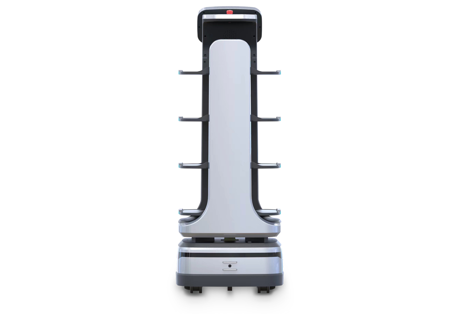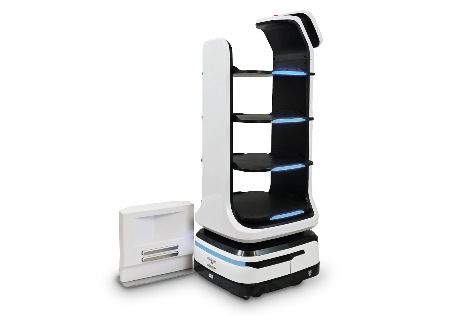 - 1 x Serviceroboter Robi4-HD, 4 Tablettebenen, 490 mm x 580 mm x 1.290 mm, TecMaschin inklusive Ladestation