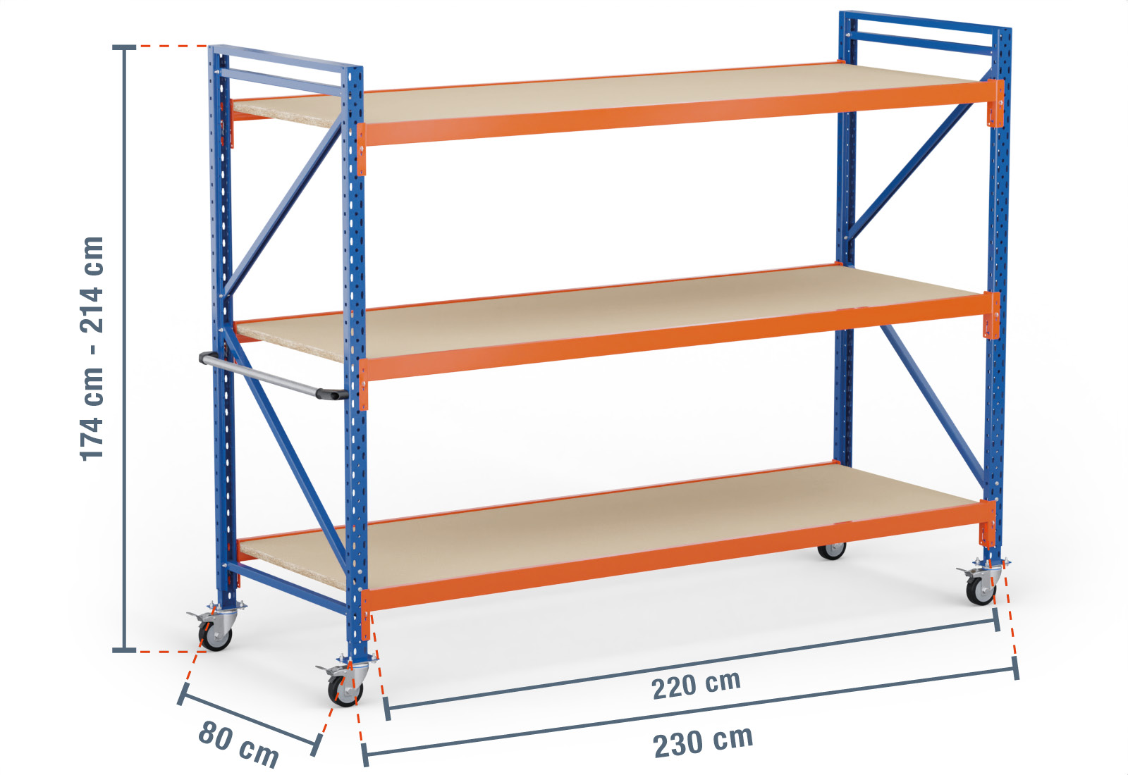 2,3 m Lagerregal fahrbar LR2000 / 80 cm tief / 1.740 - 2.140 mm hoch / 3 Ebenen / Auflage Holz