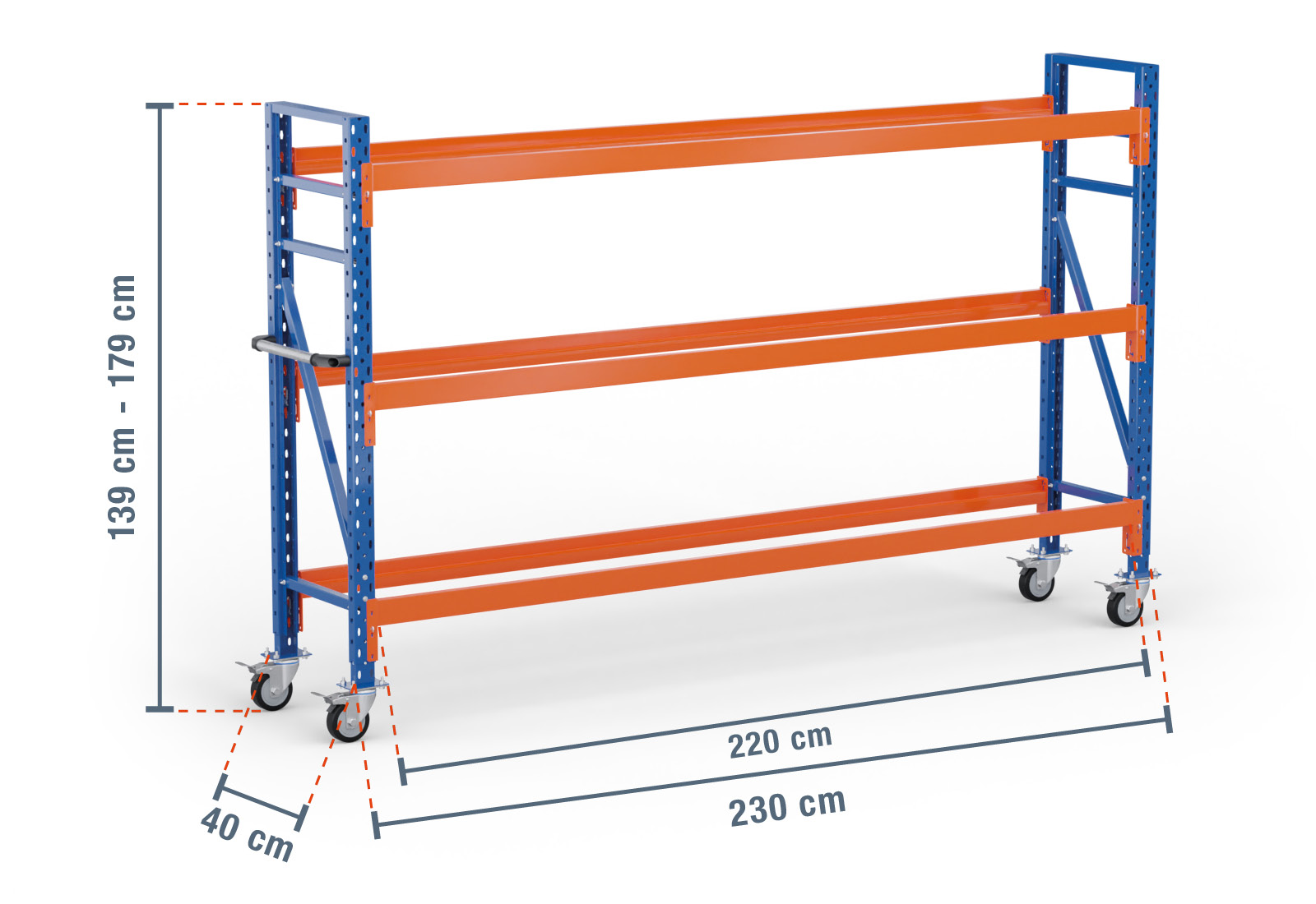 2,3 m Reifenregal fahrbar RR2000 / 40 cm tief / 1.390 - 1.790 mm hoch / 3 Ebenen