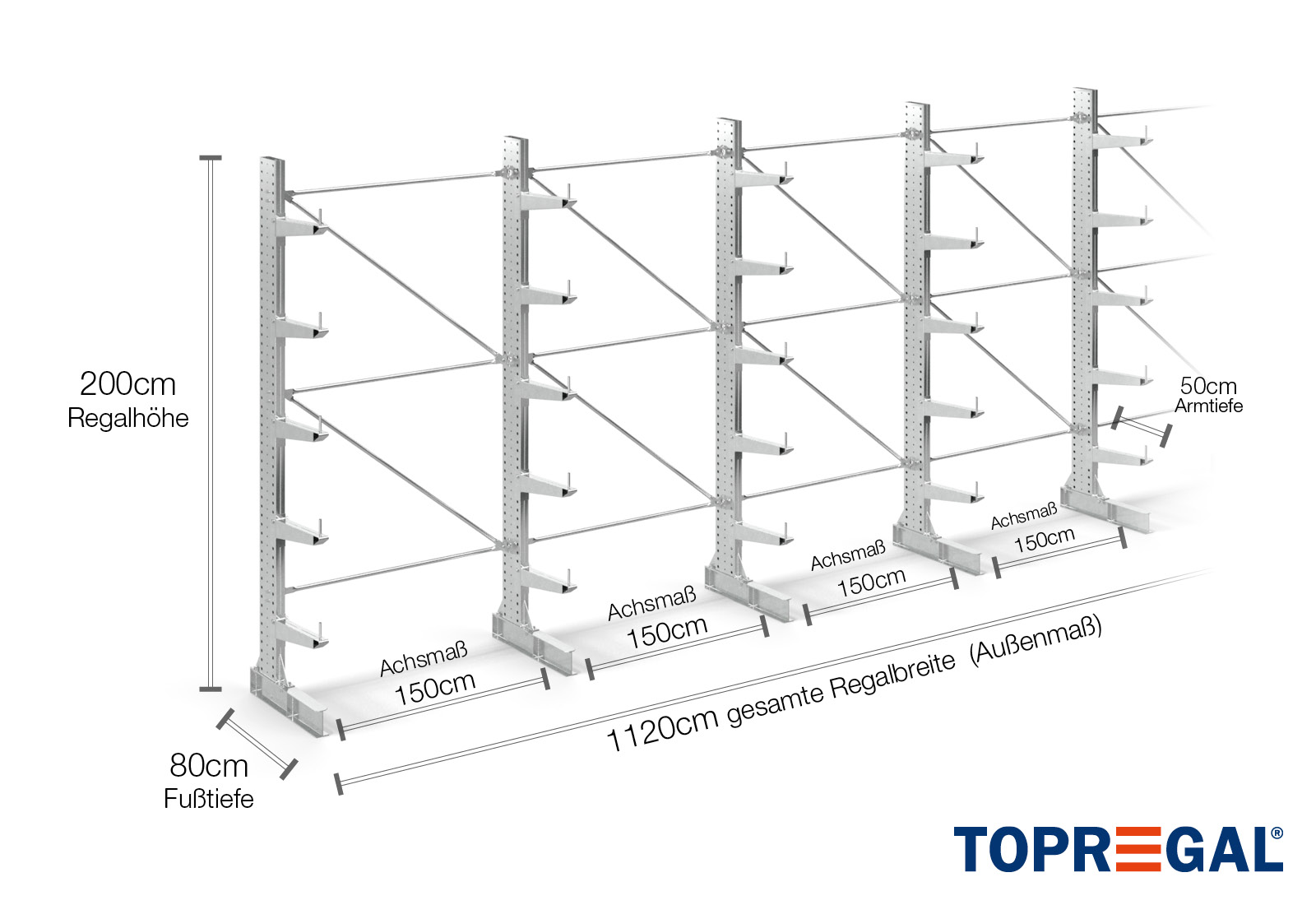 Dieses Kragarmregal in einseitiger Ausführung mit einer Breite von 11,2 m ist 2 m hoch, hat eine Gesamttiefe von 80 cm und verfügt über 5 Kragarmebenen, mit einer Armtiefe von 50 cm. Die maximale Belastung pro Arm beträgt hierbei maximal 500 kg. Die Kragarme können im Rastermaß von 50 mm individuell eingehängt und per Sicherungsbolzen und -stift gesichert werden. Auch die Fußteile können (je nach Gut) als Lagerebene genutzt werden. Um die Ladung vor versehentlichem Abrutschen zu schützen, kann am Ende eines jeden Kragarms eine Abrollsicherung eingesteckt werden. Diese ist standardmäßig im Lieferumfang enthalten.