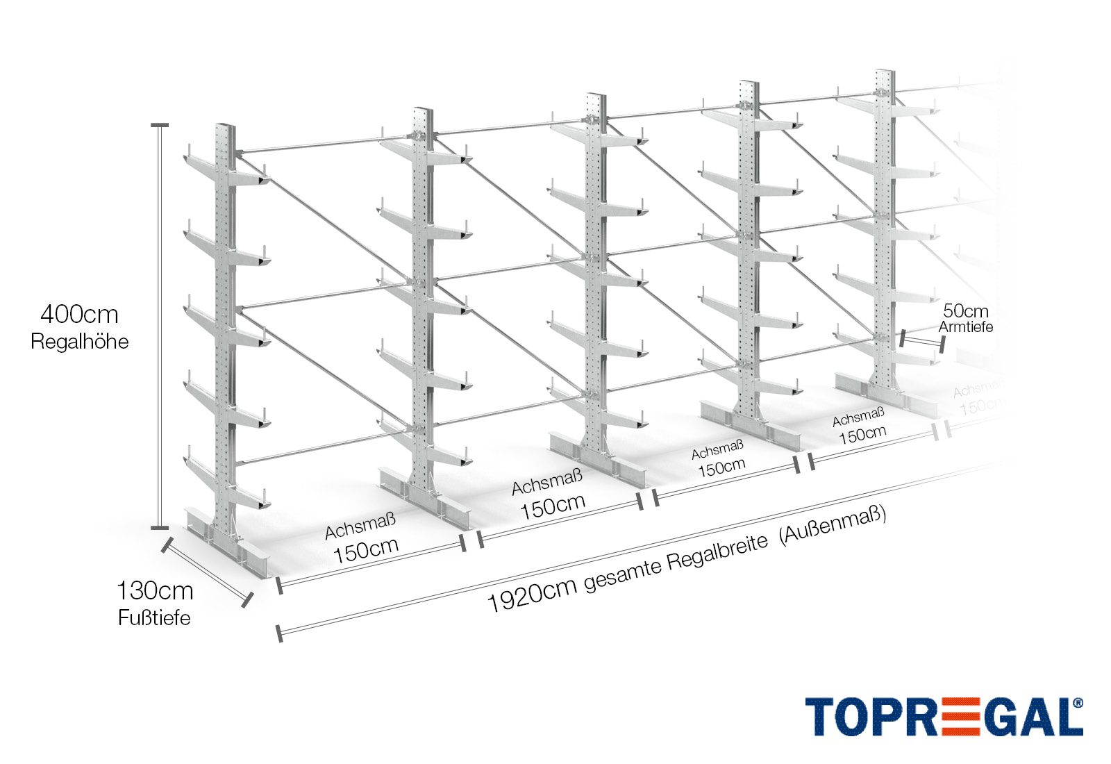 Als Achsmaß wird das Innenmaß zwischen zwei Regalständer bezeichnet. Je nach Kragarmtyp bieten wir Ihnen diese Felder in 120 cm (KR2500) und in 100 cm / 150 cm (KR3000 / KR6000) an.