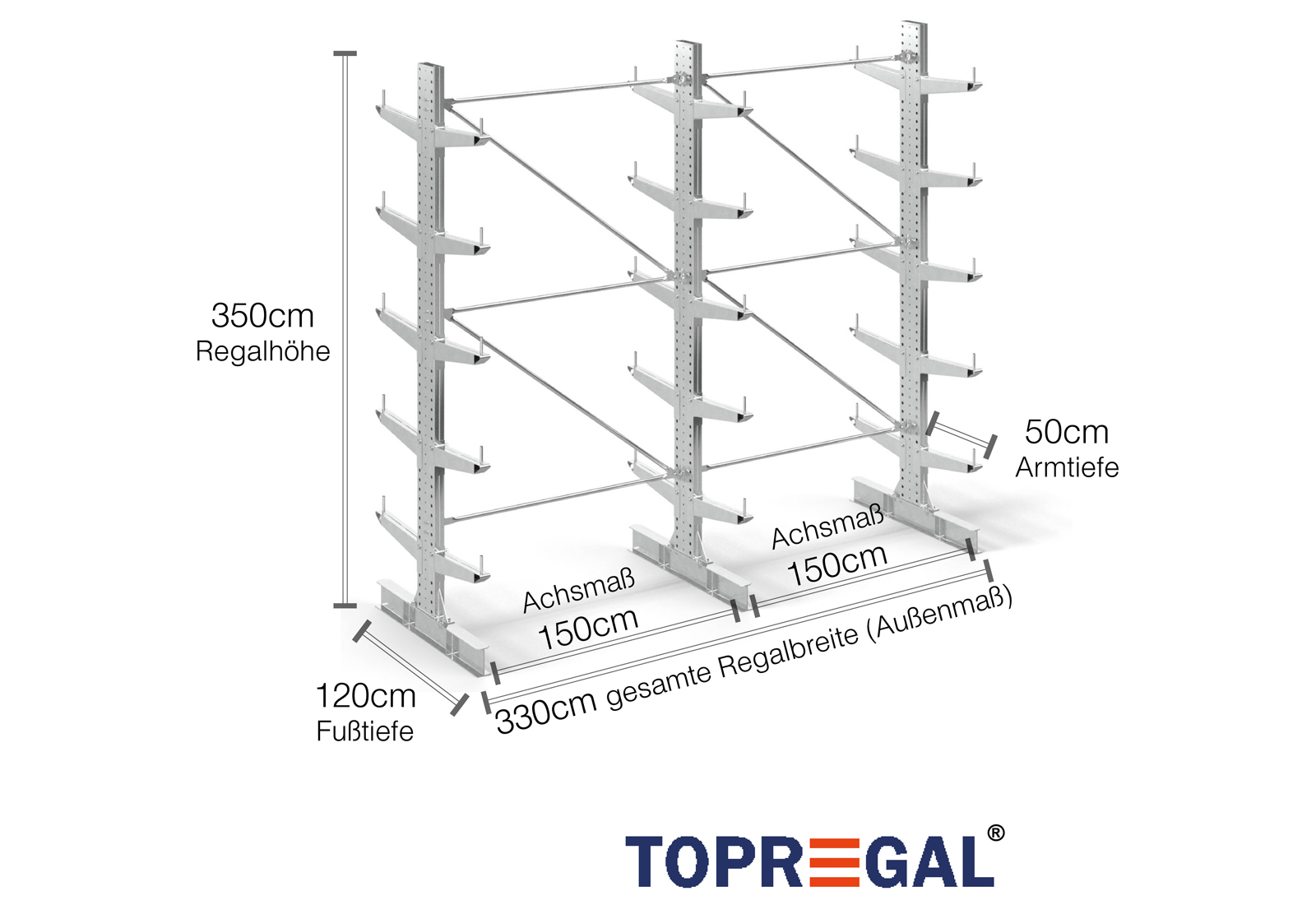 3,3 m Kragarmregal KR3000 / Feuerverzinkt / Doppelseitig / 3,5 m hoch / 50 cm Armtiefe / 5 Ebenen
