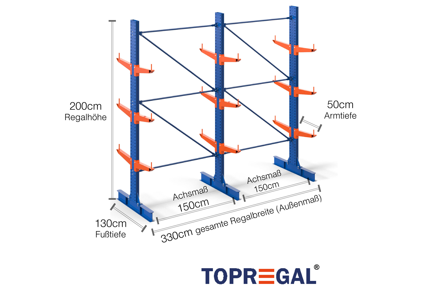 Dieses Kragarmregal in doppelseitiger Ausführung mit einer Breite von 3,3 m ist 2 m hoch, hat eine Gesamttiefe von 120 cm und verfügt über 3 Kragarmebenen, mit einer Armtiefe von 50 cm. Die maximale Belastung pro Arm beträgt hierbei maximal 500 kg. Die Kragarme können im Rastermaß von 50 mm individuell eingehängt und per Sicherungsbolzen und -stift gesichert werden. Auch die Fußteile können (je nach Gut) als Lagerebene genutzt werden. Um die Ladung vor versehentlichem Abrutschen zu schützen, kann am Ende eines jeden Kragarms eine Abrollsicherung eingesteckt werden. Diese ist standardmäßig im Lieferumfang enthalten.