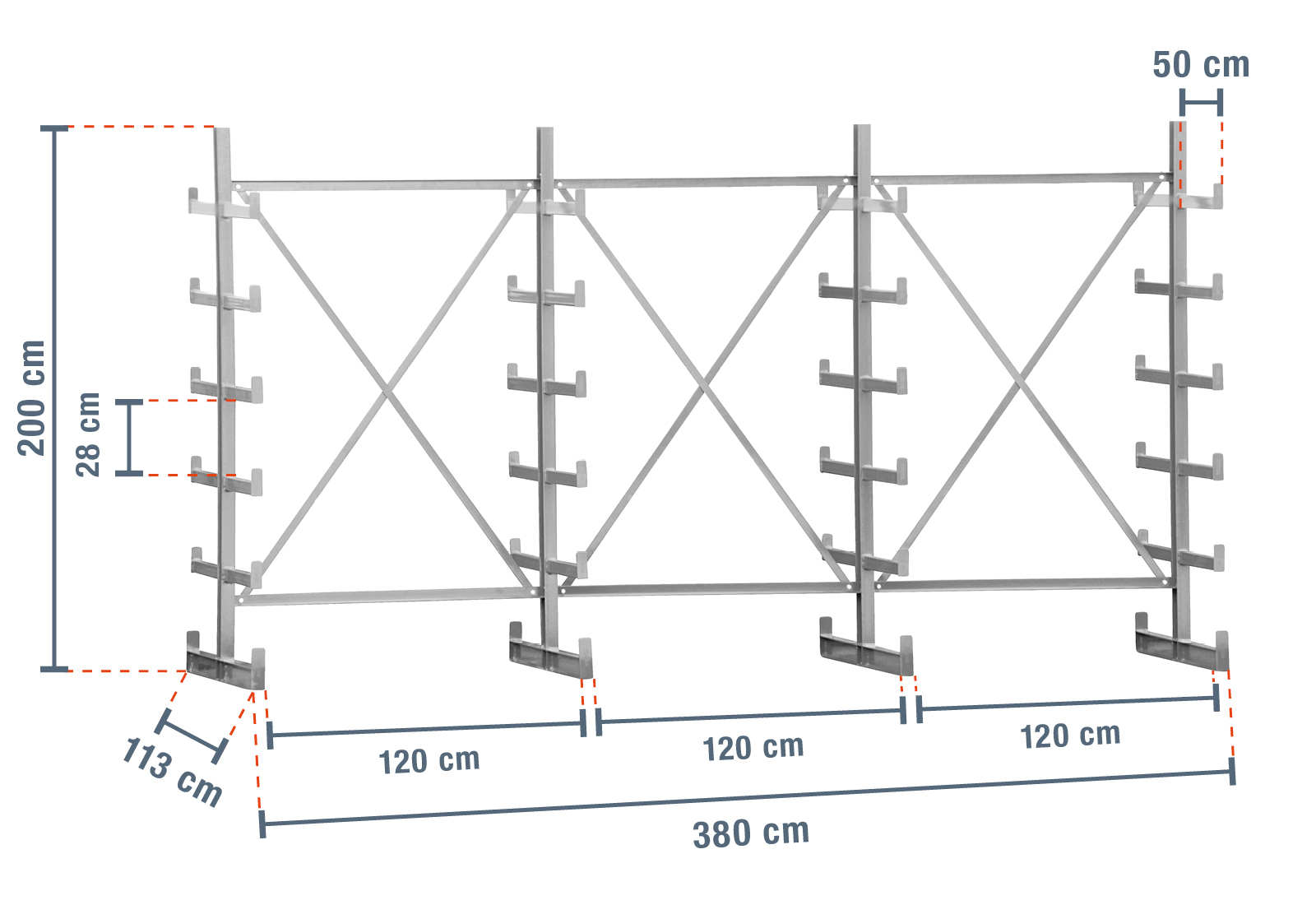 Die einzelnen Ständer werden mithilfe von 2 Quer- und Diagonalstreben (Achsmaß 1.200 mm) miteinander verschraubt. Jeder Kragarm hat eine Auflagebreite von 30 mm und ist mit einer 50 mm hohen Abrollsicherung versehen. Das 50 cm lange Fußteil hat eine Auflagetiefe von 50 cm, eine Auflagebreite von 50 mm und eine 70 mm hohe Abrollsicherung. Somit können die Fußteile auch als Lagerebene genutzt werden.