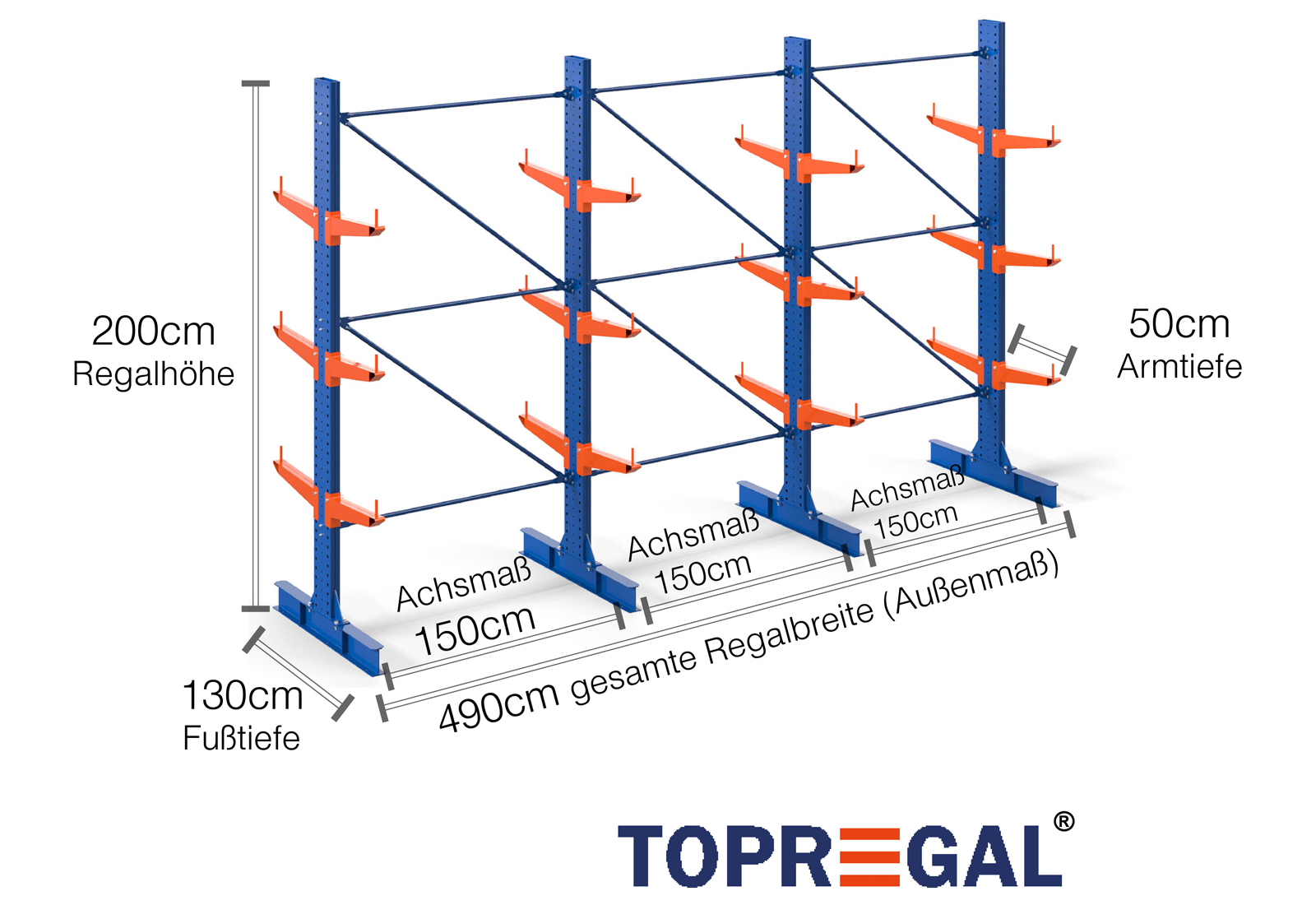 Dieses Kragarmregal in doppelseitiger Ausführung mit einer Breite von 4,9 m ist 2 m hoch, hat eine Gesamttiefe von 120 cm und verfügt über 3 Kragarmebenen, mit einer Armtiefe von 50 cm. Die maximale Belastung pro Arm beträgt hierbei maximal 500 kg. Die Kragarme können im Rastermaß von 50 mm individuell eingehängt und per Sicherungsbolzen und -stift gesichert werden. Auch die Fußteile können (je nach Gut) als Lagerebene genutzt werden. Um die Ladung vor versehentlichem Abrutschen zu schützen, kann am Ende eines jeden Kragarms eine Abrollsicherung eingesteckt werden. Diese ist standardmäßig im Lieferumfang enthalten.