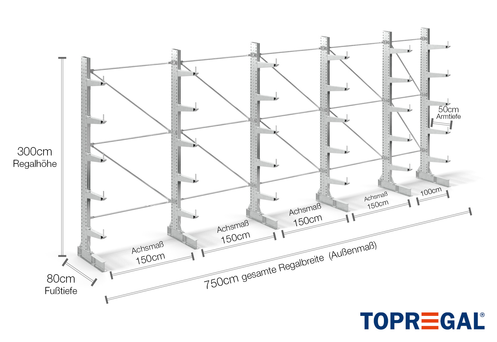 Als Achsmaß wird das Innenmaß zwischen zwei Regalständer bezeichnet. Je nach Kragarmtyp bieten wir Ihnen diese Felder in 120 cm (KR2500) und in 100 cm / 150 cm (KR3000 / KR6000) an.