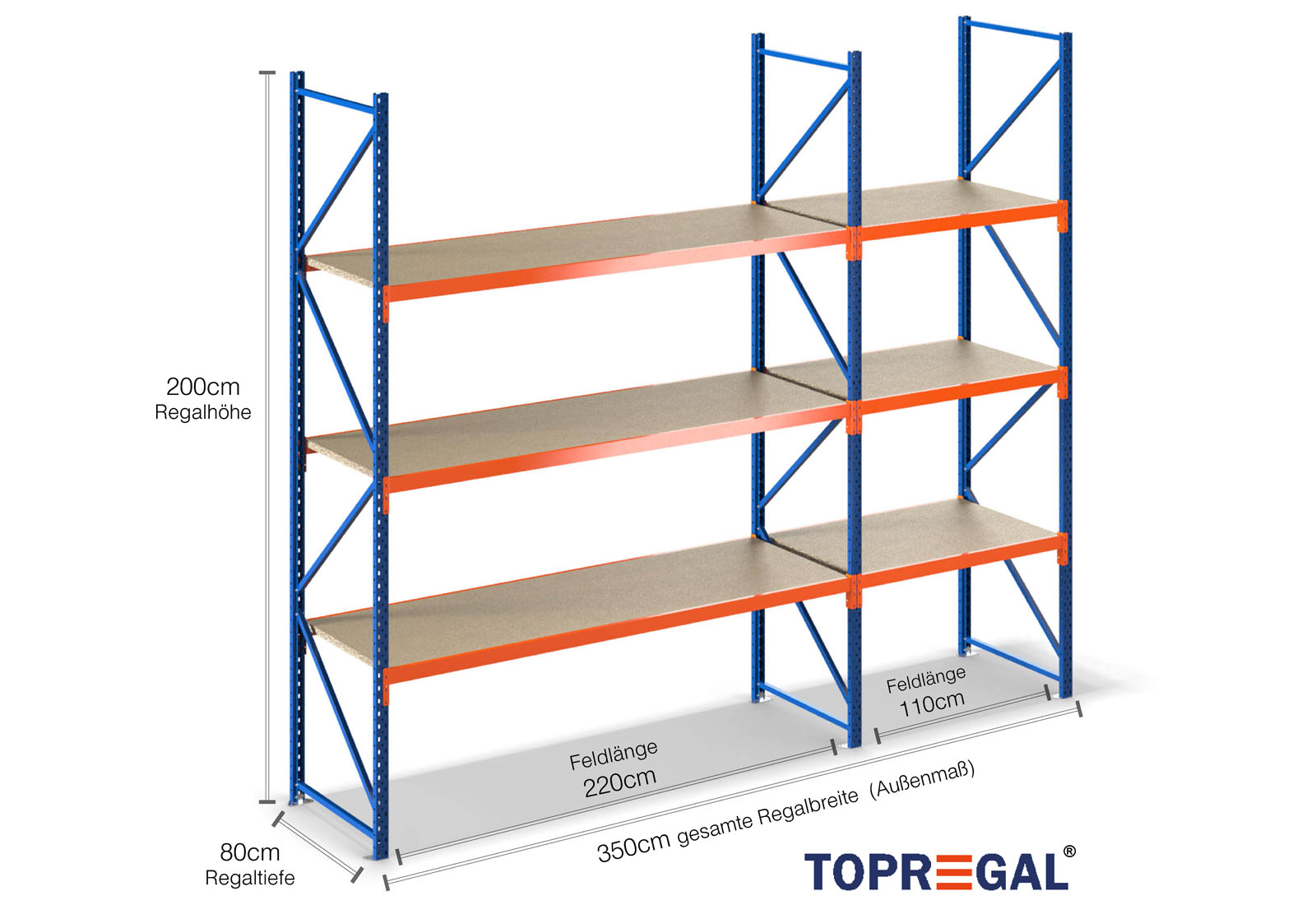 3,5 m Lagerregal LR2000 / 80 cm tief / 2 m hoch / 3 Ebenen / Auflage Holz