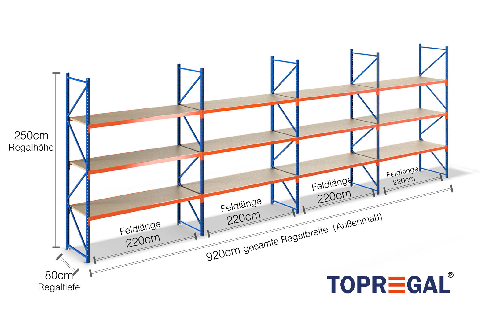 Dieses Lagerregal besticht mit seiner Höhe von 2,5 m, ist 80 cm tief und hat eine Breite von 9,2 m. Die 3 Ebenen bieten jeweils eine maximale Belastung von 500 kg, wobei die maximale Belastung zwischen zwei Ständern (die Feldlast) von 2.000 kg nicht überschritten werden darf. Diese Angaben beziehen sich immer auf eine gleichmäßige Belastung der Regale. Der Aufbau erfolgt dank dem Stecksystem problemlos und schnell. Für die Weitspannregale von TOPREGAL gibt es zudem eine umfangreiche Auswahl an Einzelteilen und Zubehör, wie z.B. Regalständern, Traversen, Magnetbändern und Sichtlagerkästen.