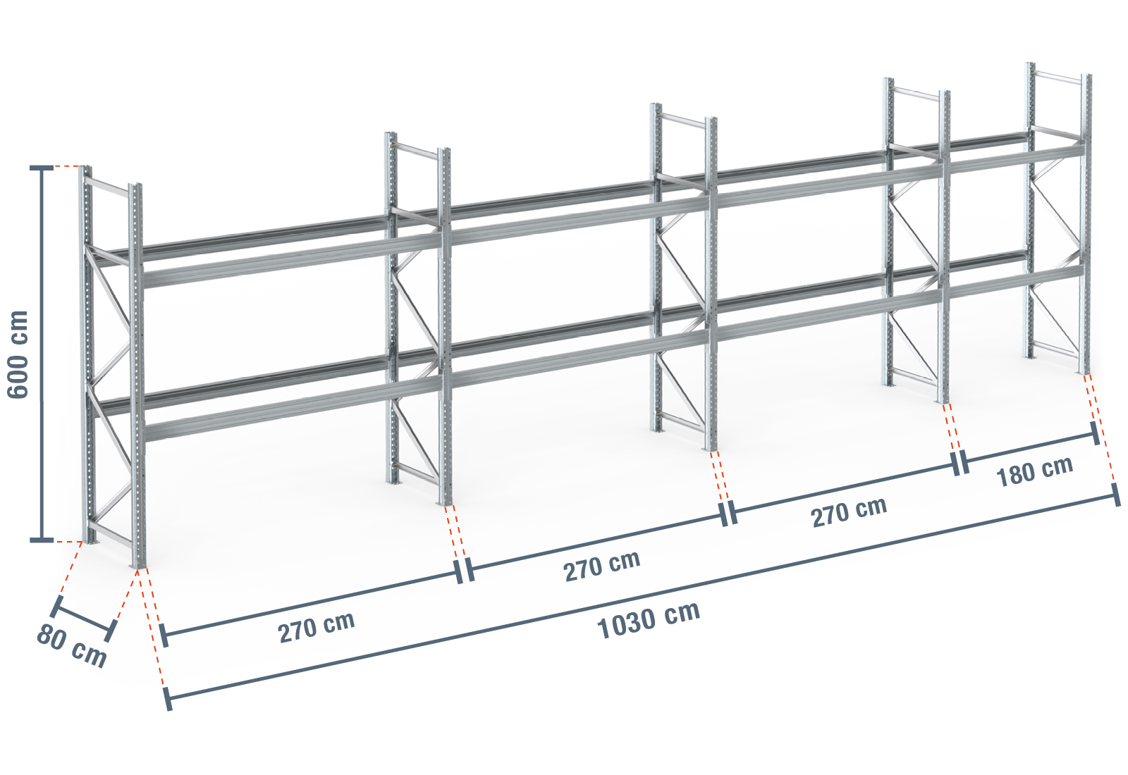 10,3 m Palettenregal PR9000F Feuerverzinkt / 80 cm tief / 6 m hoch / 2 Ebenen für 33 Europaletten