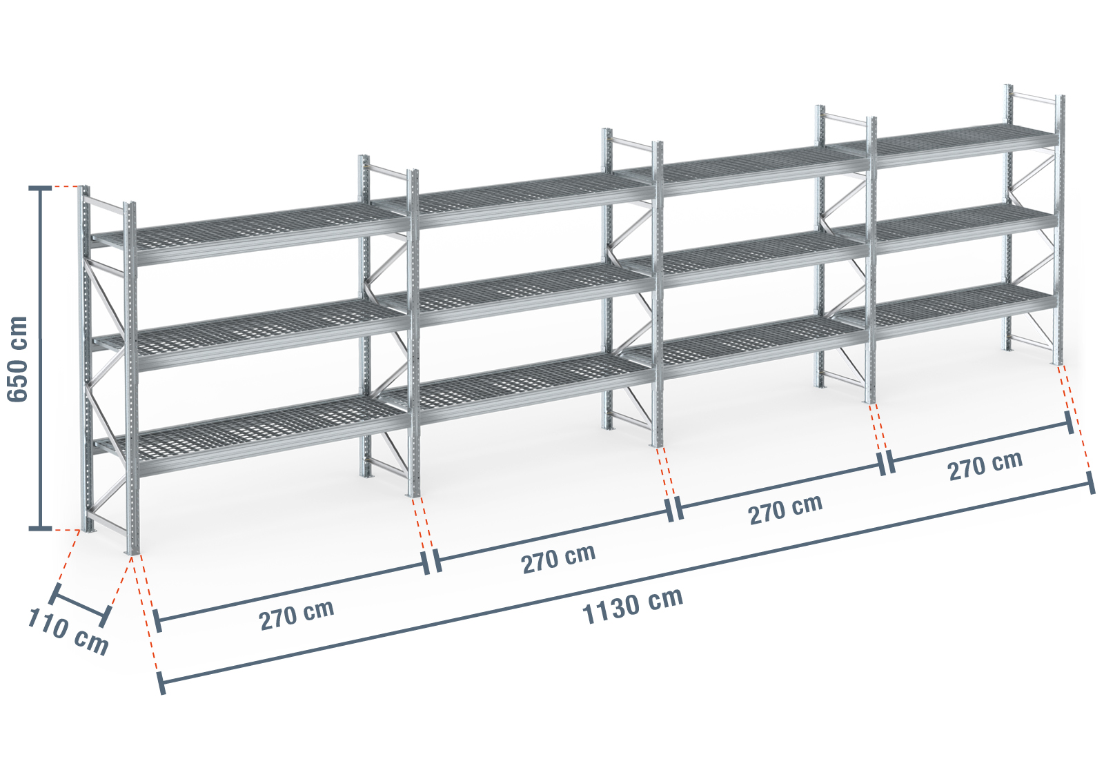 11,3 m Palettenregal PR9000F Feuerverzinkt / 110 cm tief / 6,5 m hoch / 3 Ebenen / Auflage Gitterrost