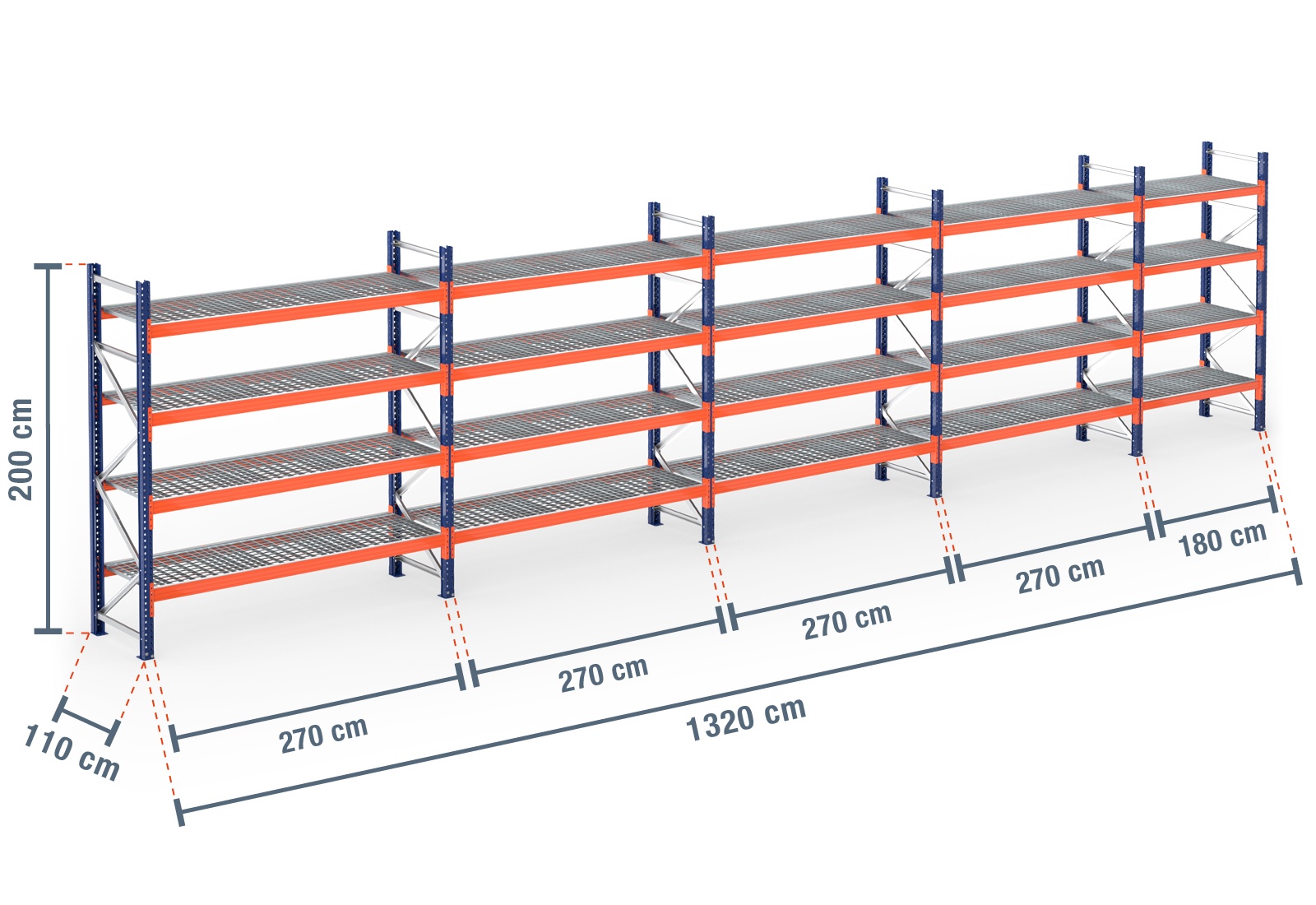 13,2 m Palettenregal PR9000 / 110 cm tief / 2 m hoch / 4 Ebenen / Auflage Gitterrost