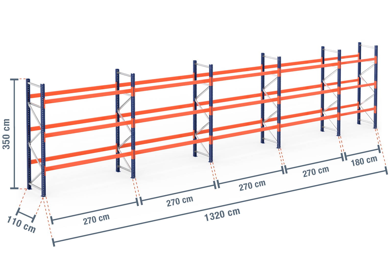 13,2 m Palettenregal PR9000 / 110 cm tief / 3,5 m hoch / 3 Ebenen für 56 Europaletten