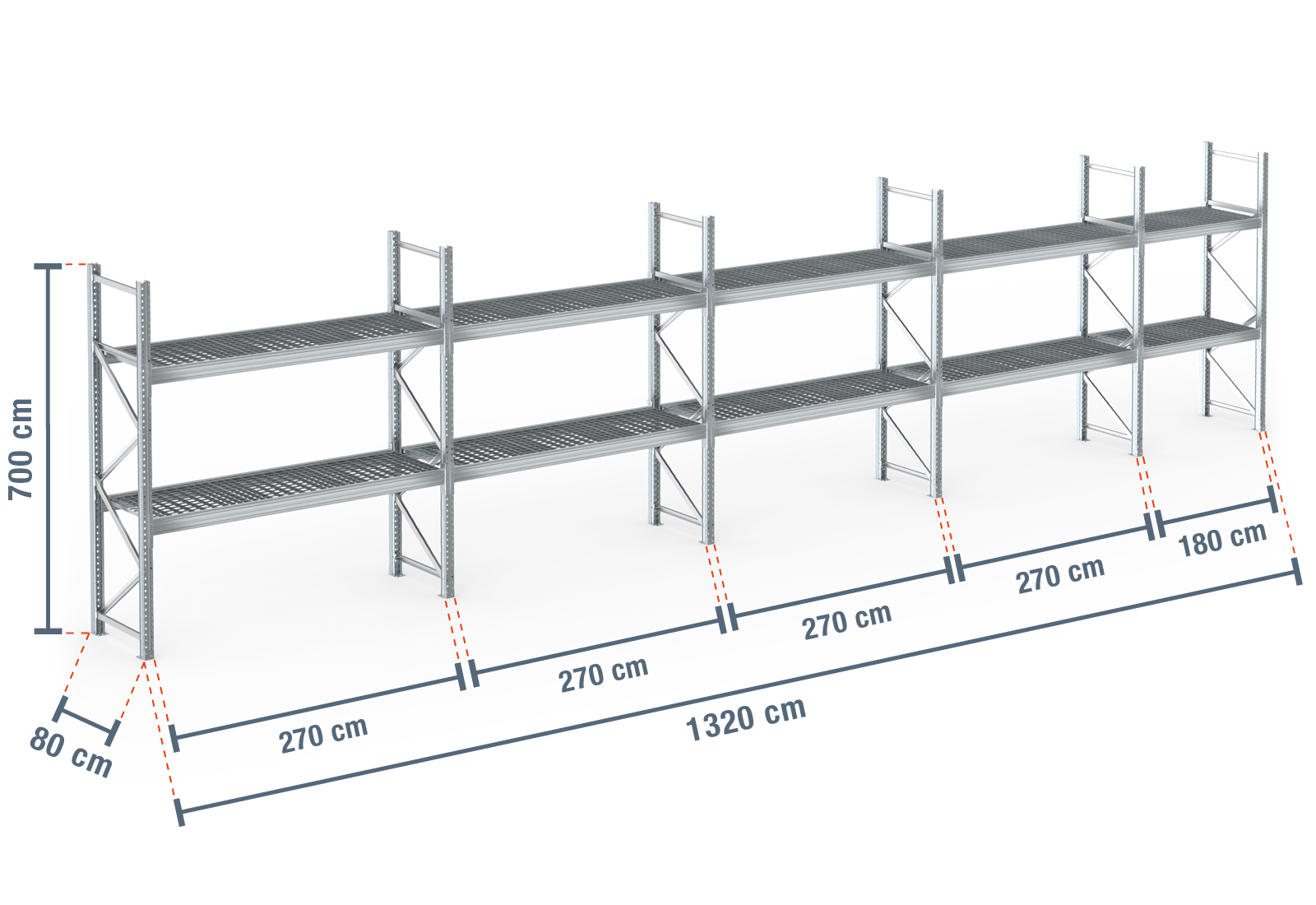 13,2 m Palettenregal PR9000F Feuerverzinkt / 80 cm tief / 7 m hoch / 2 Ebenen / Auflage Gitterrost