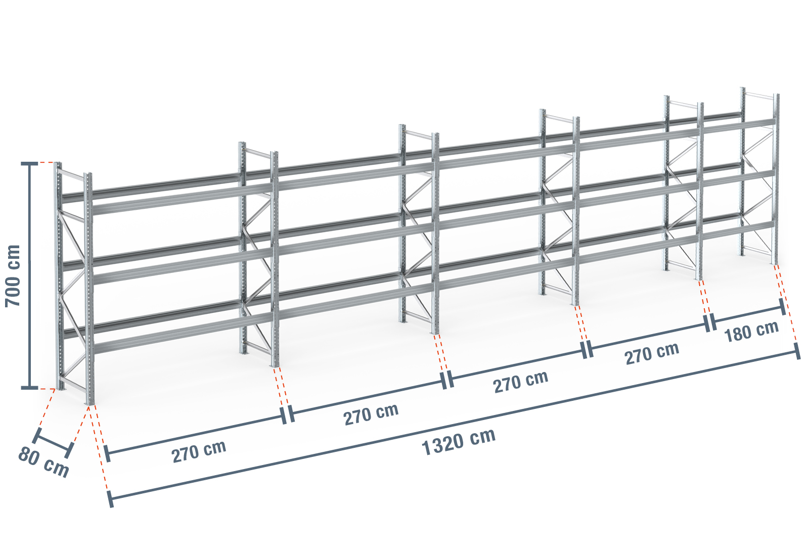 13,2 m Palettenregal PR9000F Feuerverzinkt / 80 cm tief / 7 m hoch / 3 Ebenen für 56 Europaletten