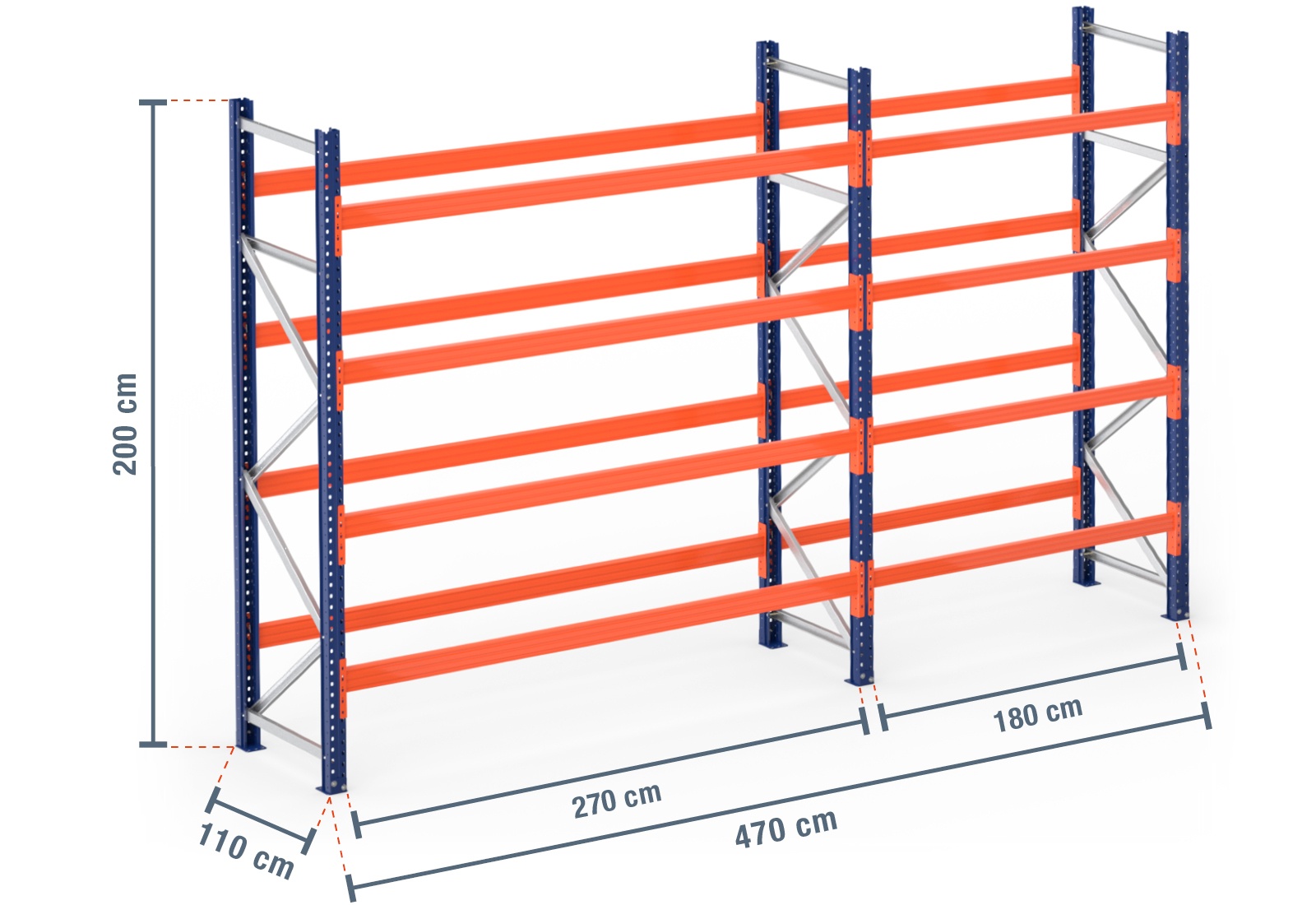 4,7 m Palettenregal PR9000 / 110 cm tief / 2 m hoch / 4 Ebenen für 25 Europaletten