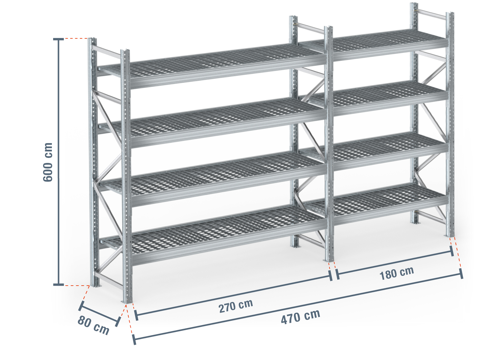 4,7 m Palettenregal PR9000F Feuerverzinkt / 80 cm tief / 6 m hoch / 4 Ebenen / Auflage Gitterrost