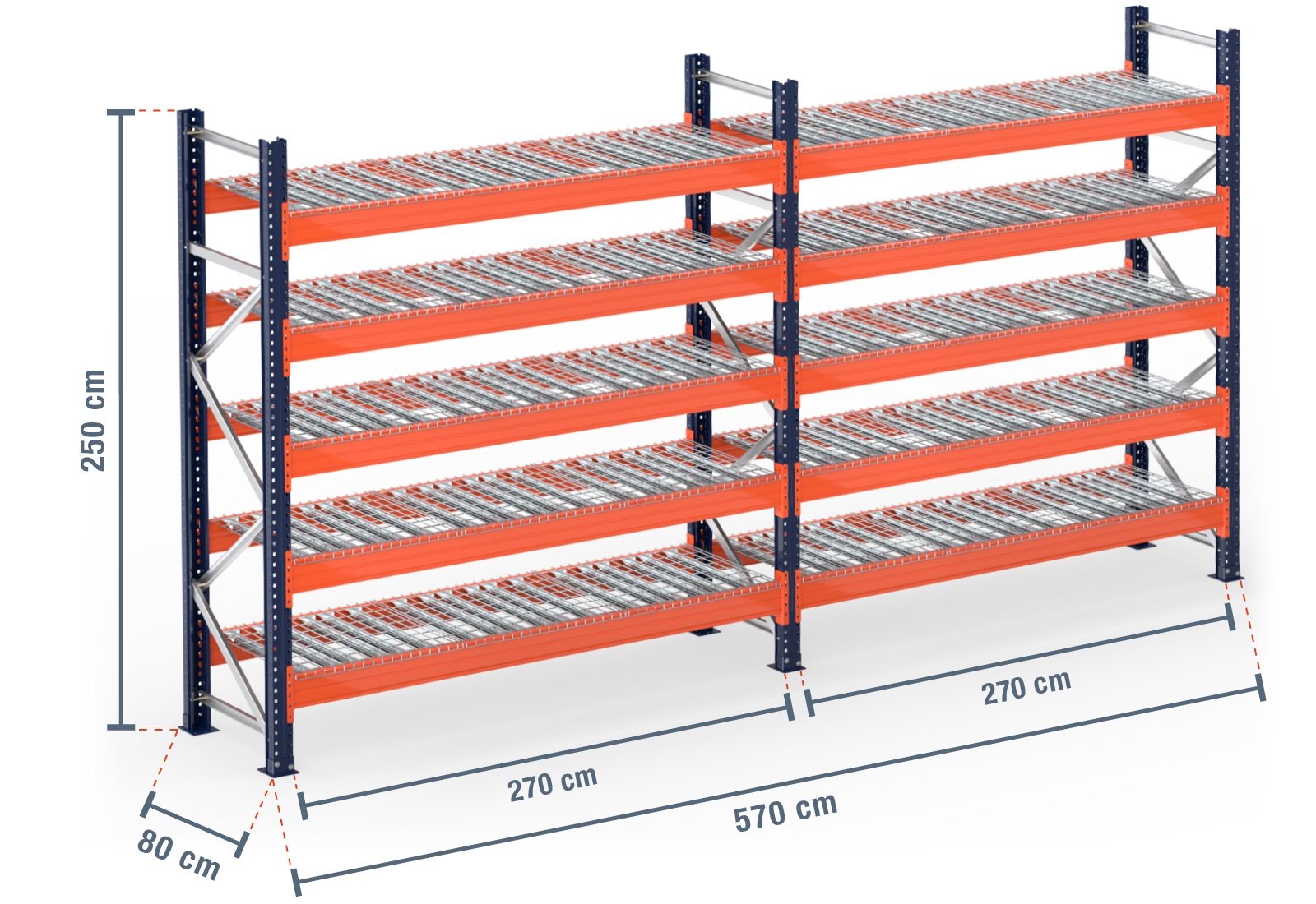 5,7 m Palettenregal PR15000 / 80 cm tief / 2,5 m hoch / 5 Ebenen / Auflage Drahtgitter