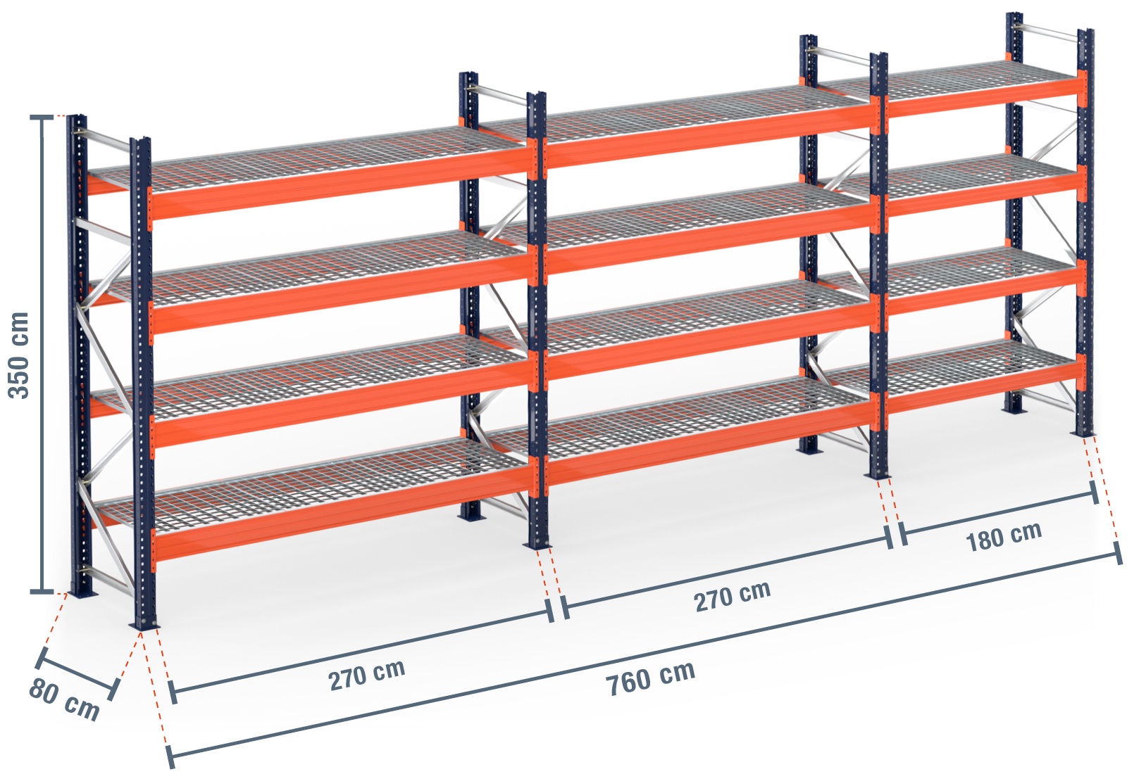 7,6 m Palettenregal PR15000 / 80 cm tief / 3,5 m hoch / 4 Ebenen / Auflage Gitterrost