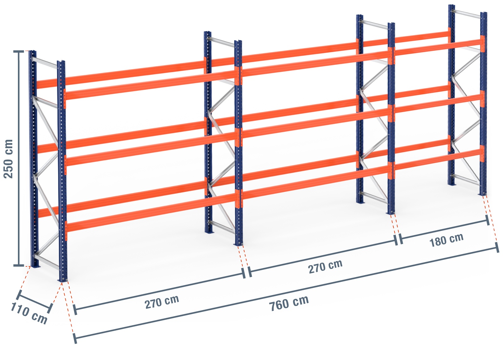 7,6 m Palettenregal PR9000 / 110 cm tief / 2,5 m hoch / 3 Ebenen für 32 Europaletten