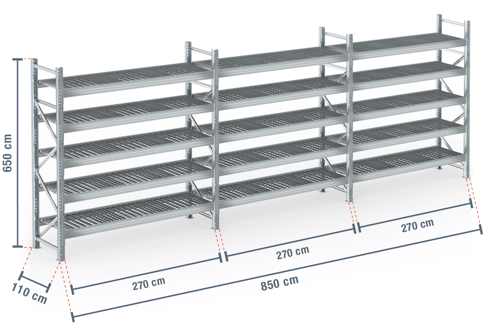 8,5 m Palettenregal PR9000F Feuerverzinkt / 110 cm tief / 6,5 m hoch / 5 Ebenen / Auflage Gitterrost