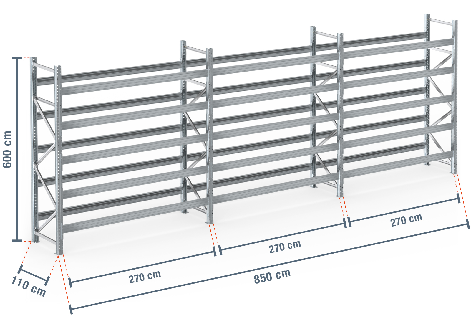 8,5 m Palettenregal PR9000F Feuerverzinkt / 110 cm tief / 6 m hoch / 5 Ebenen für 54 Europaletten